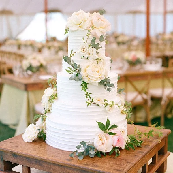 Bánh cưới 123.Bánh kem cưới gắn hoa về cơ bản khá giống bánh cưới truyền thống chỉ thay hoa kem bằng các loại hoa tươi để tạo điểm nhấn. Bánh kem cưới gắn hoa mang đến sự nữ tính, mềm mại phù hợp với những đám cưới mang phong cách cổ điển, truyền thống.Bạn nên chọn loại hoa trang trí bánh kem cưới gắn hoa theo mùa để tiết kiệm chi phí.