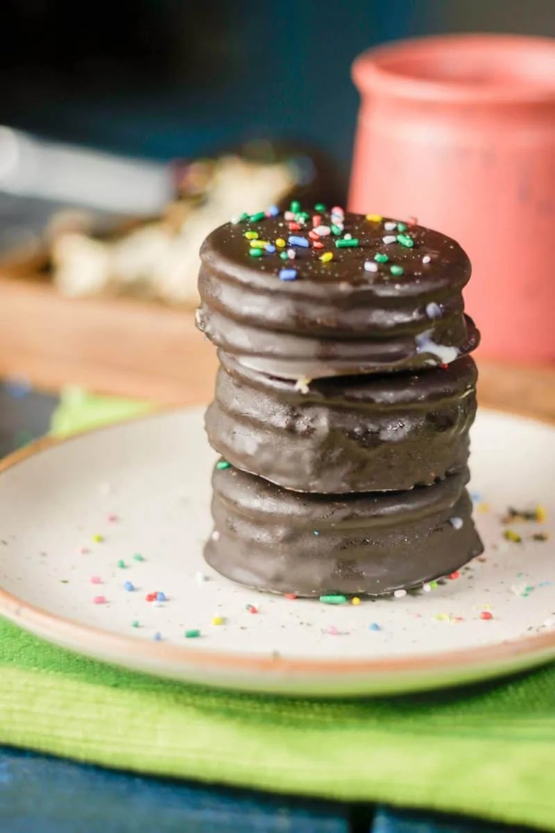 Bước 3: Chocolate đun chảy rồi để cho nguội bớt, sau đó nhúng ngập bánh tiramisu sinh nhật phần bánh kẹp marshmallow vào tô chocolate đun chảy …