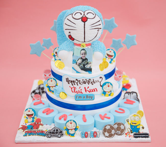 Bánh kem Doraemon hai tầng. Một chiếc bánh kem hình Doremon dễ thương, ngộ nghĩnh chắc chắn sẽ là món quà lý tưởng để ông bà, cha mẹ, người thân… có thể dành tặng bé nhân ngày sinh nhật. Món quà này sẽ còn đặc biệt và ý nghĩa hơn nếu bé yêu có niềm đam mê với chú mèo máy dễ thương nữa đấy.