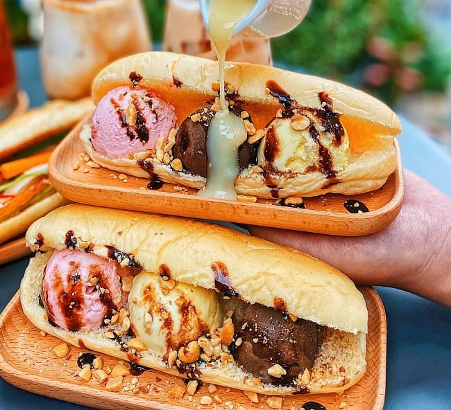 Bánh mì kẹp kem. Món bánh mì kẹp kem với hương vị đặc biệt hấp dẫn và độc đáo từng là một phần tuổi thơ ý nghĩa của nhiều thế hệ. Đây cũng được mệnh danh là món ăn vặt từ thời “ông bà anh”, món ăn huyền thoại và chưa bao giờ hết hot. Cùng tìm hiểu thêm hương vị đặc trưng của món ăn này nhé!