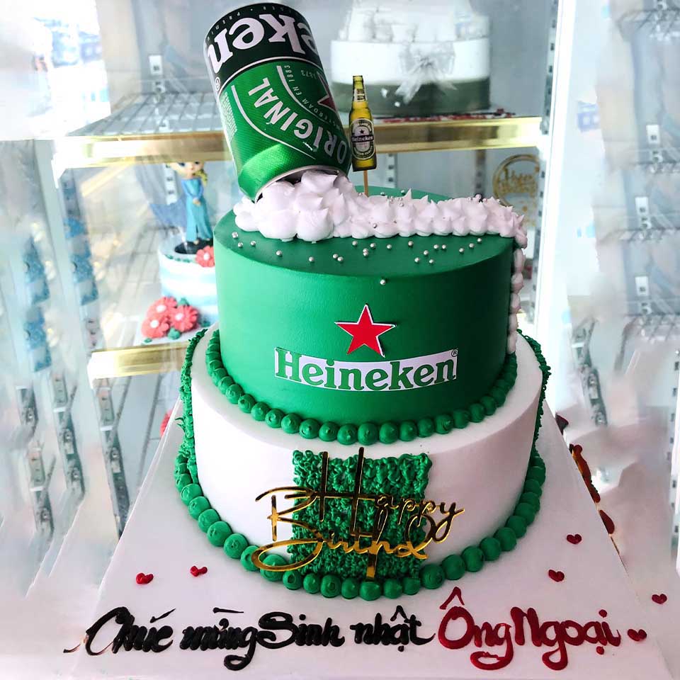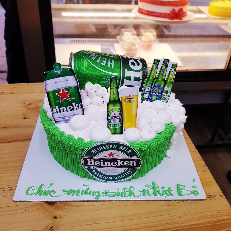 Bánh sinh nhật bia Heineken. Bánh kem rau câu được đóng hộp kín đáo, có thể bảo quản dễ dàng nơi khô mát hay trong ngăn mát tủ lạnh mà không sợ sản phẩm hư hỏng hay biến chất. Người dùng có thể mang theo dễ dàng khi tổ chức tiệc sinh nhật, thôi nôi, hỏi, cưới, tất niên…